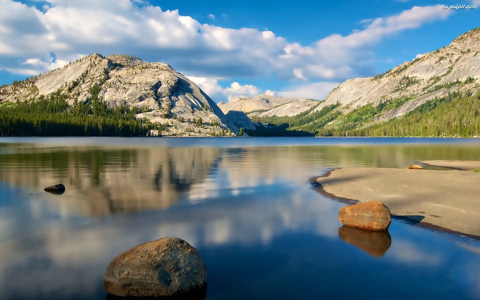 Góry, Obłoki, Odbicie, Kamienie, Jezioro, Drzewa Na Pulpit