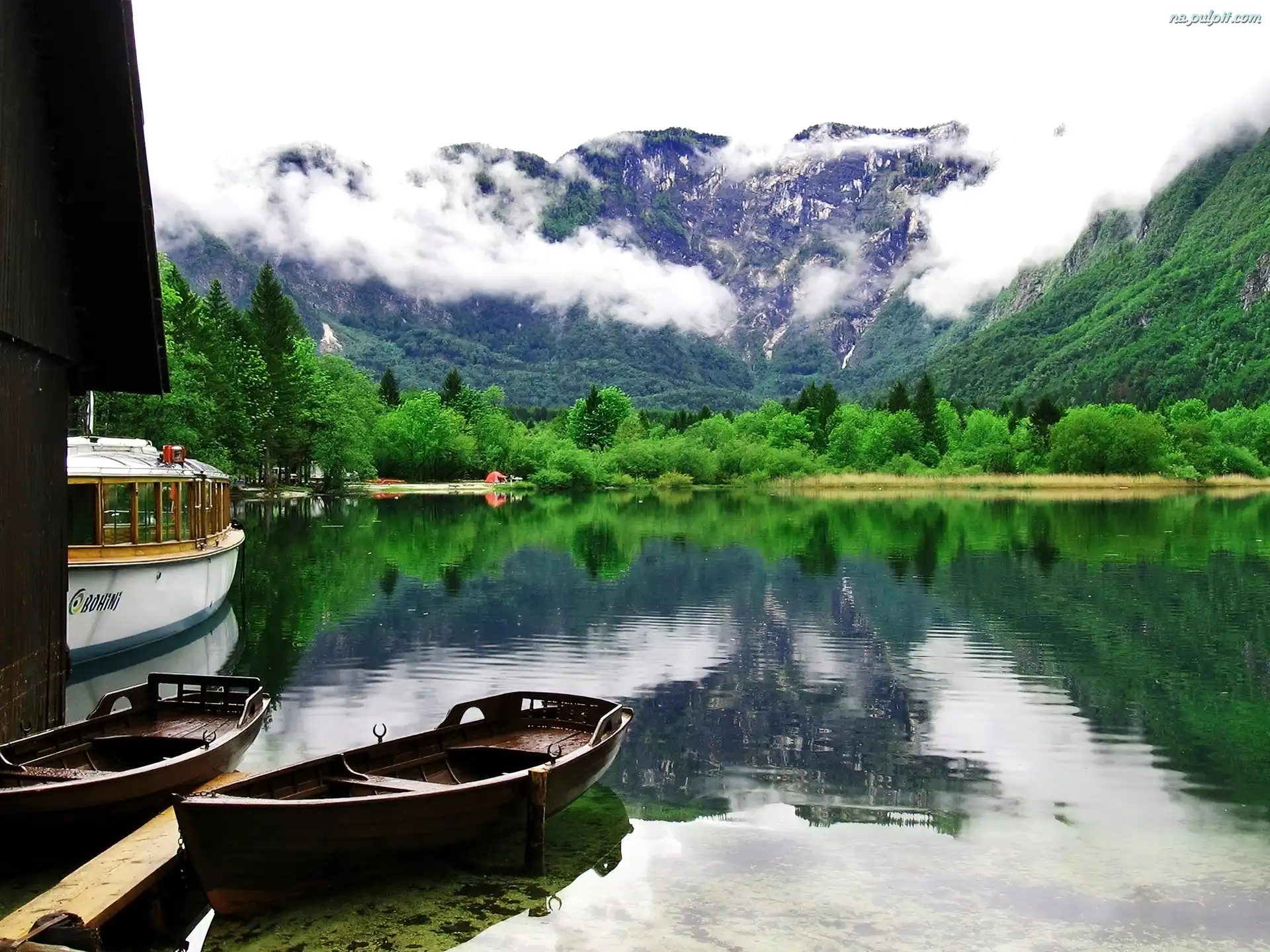 Łódki, Jezioro, Góry, Mgła Na Pulpit