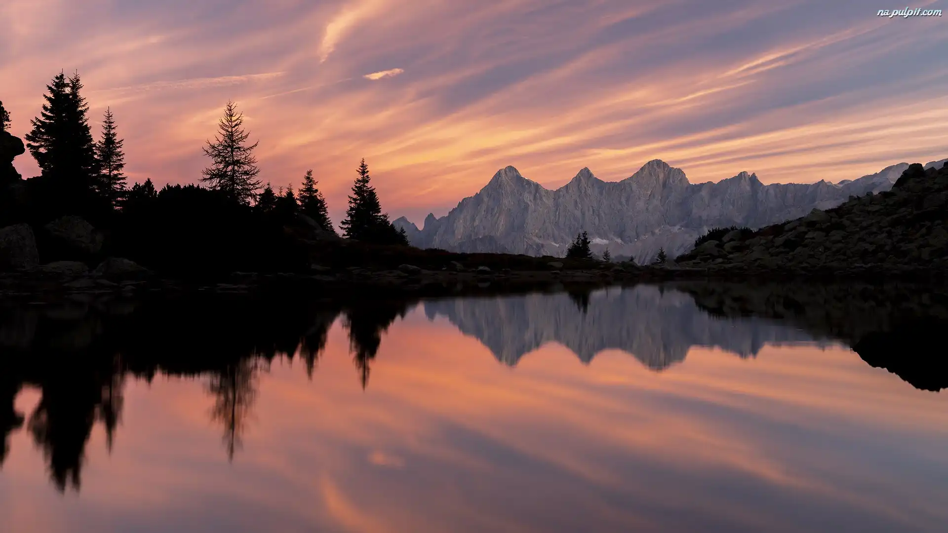 Drzewa, Zachód słońca, Góry, Odbicie, Jezioro Na Pulpit