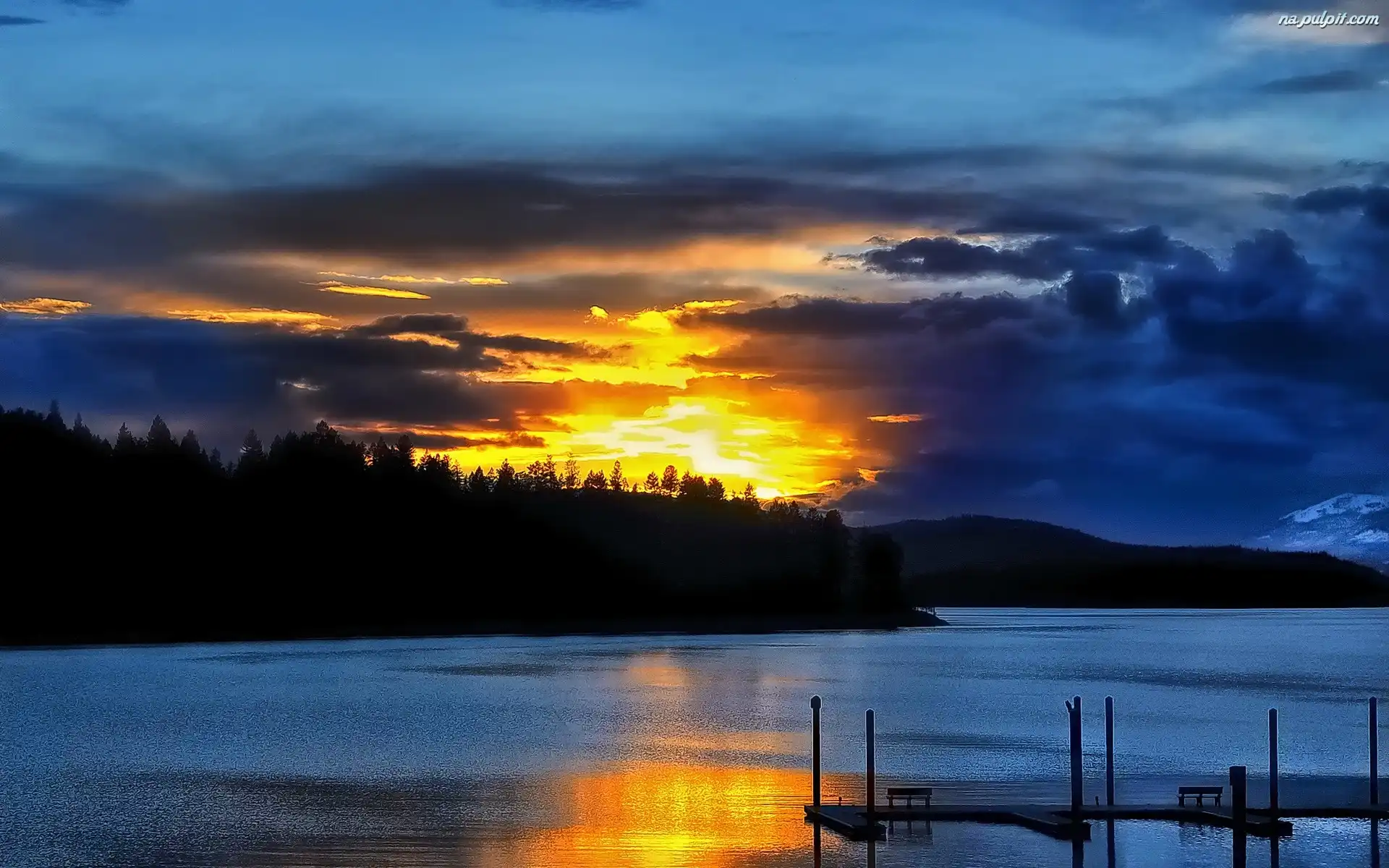 Góry, Zachód, Słońca, Lasy, Jezioro, Chmury Na Pulpit