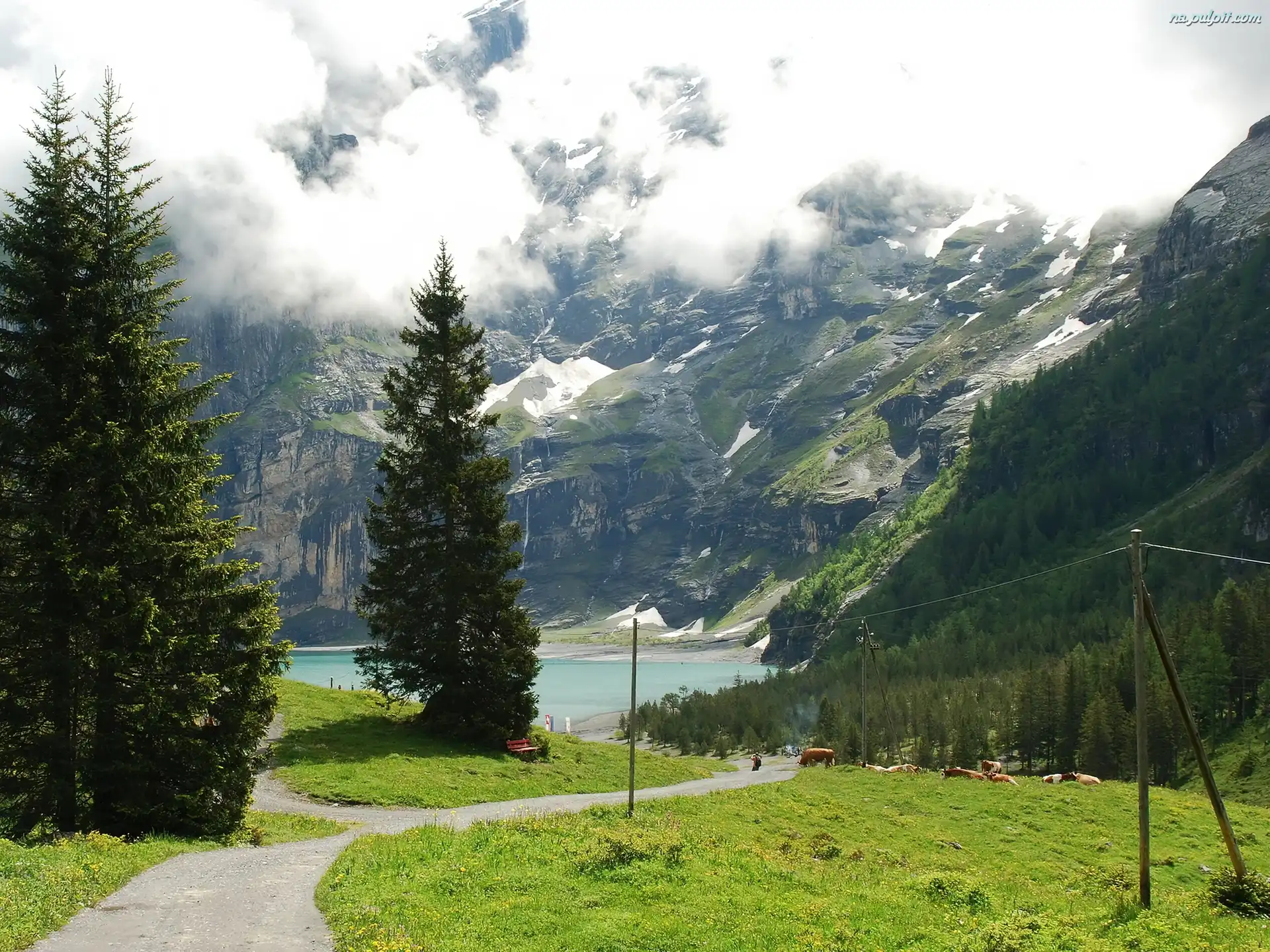 Świerki, Jezioro, Góry, Chmury Na Pulpit