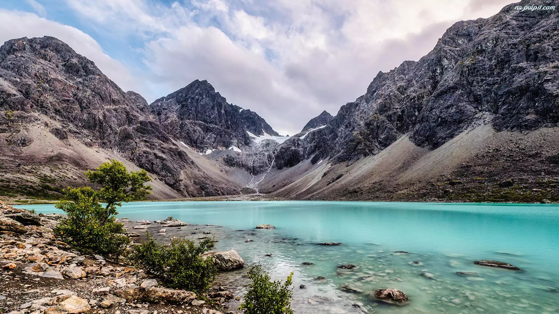 Chmury, Niebo, Krzewy, Góry, Jezioro, Kamienie, Białe Na Pulpit
