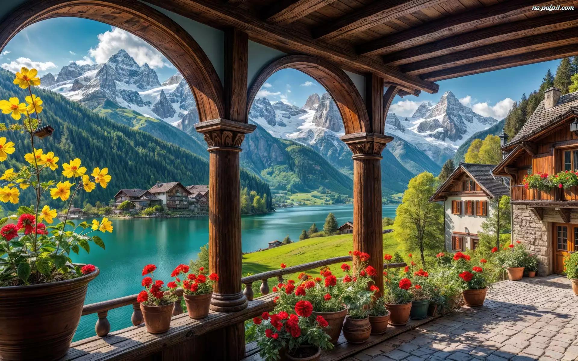 Grafika, Jezioro, Kwiaty, Góry, Las, Drzewa, Domy Na Pulpit