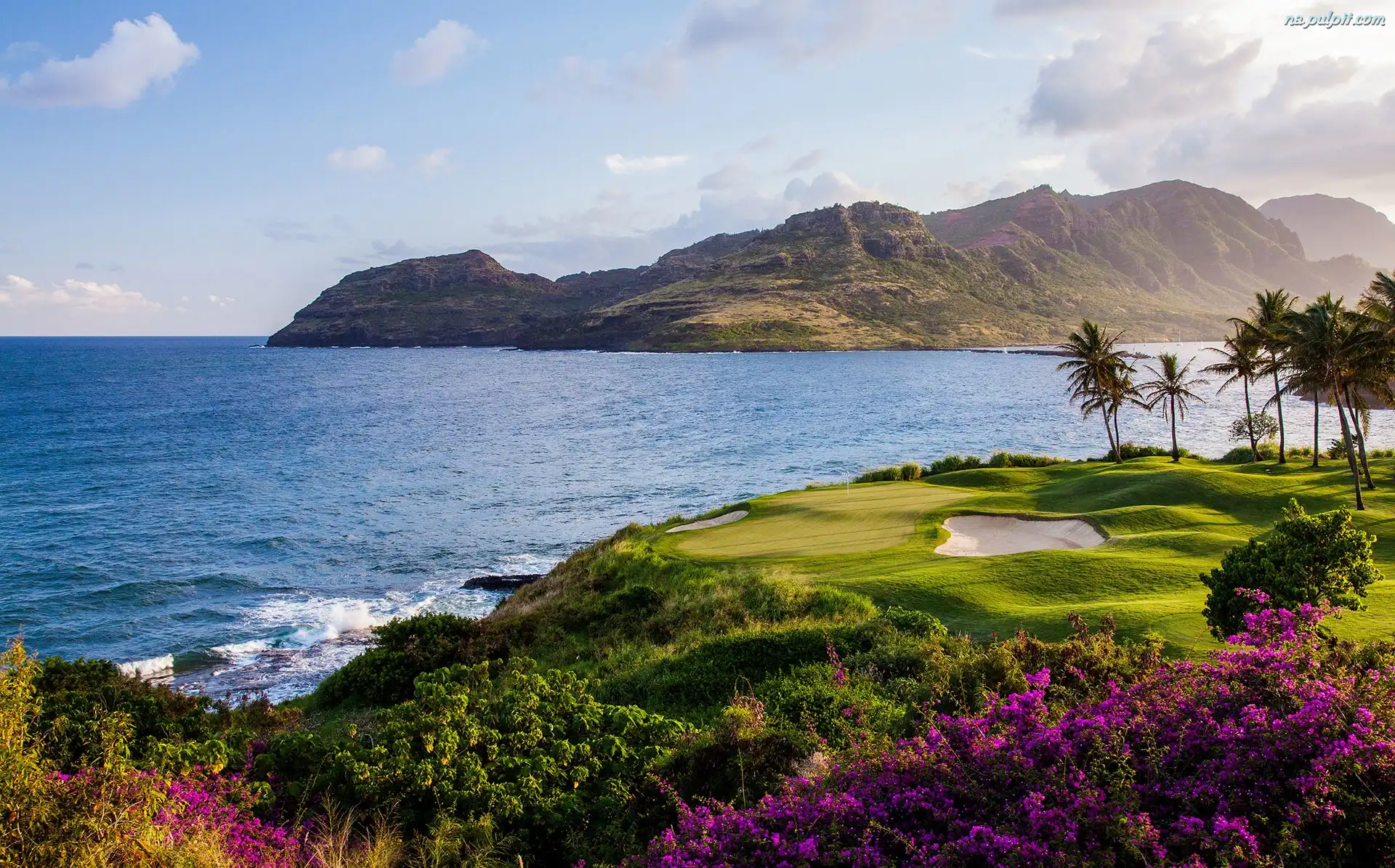 Kwiaty, Góry, Krzewy, Golfowe, Pole, Morze, Palmy