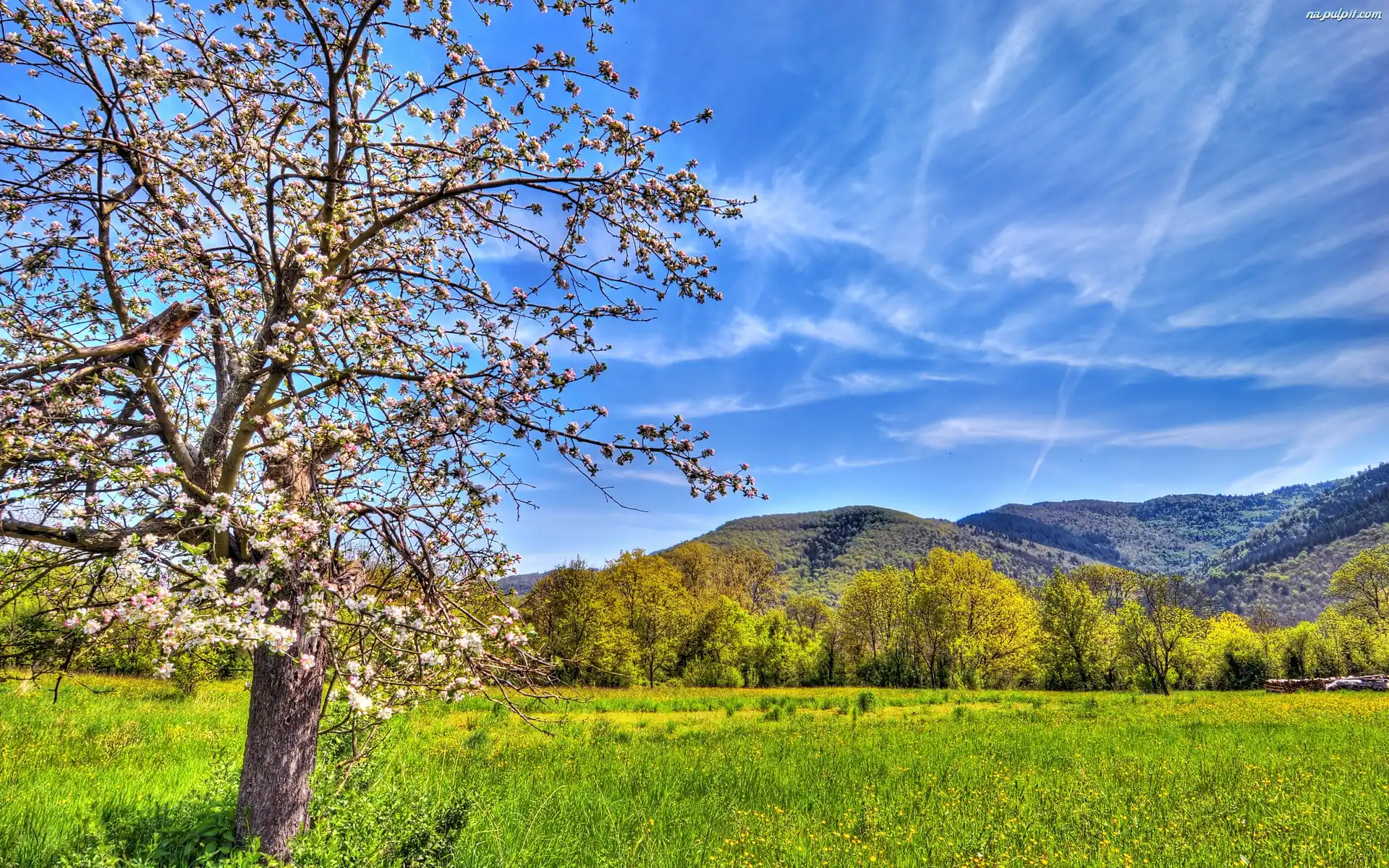 Góry, Drzewo, Kwitnące, Łąka