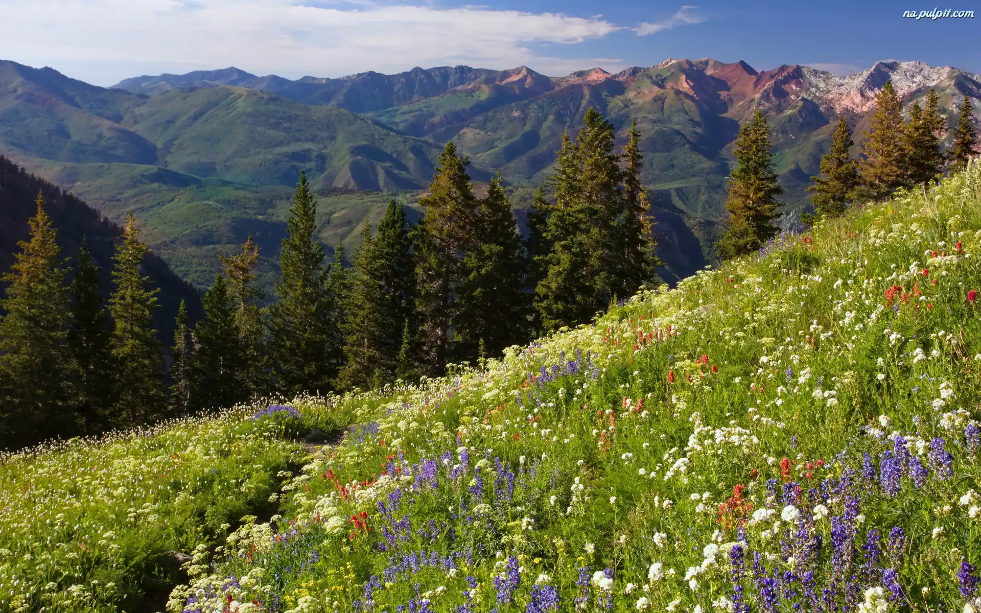 Lato, Kwiaty, Łąka, Góry, Drzewa, Polana, Ścieżka Na Pulpit