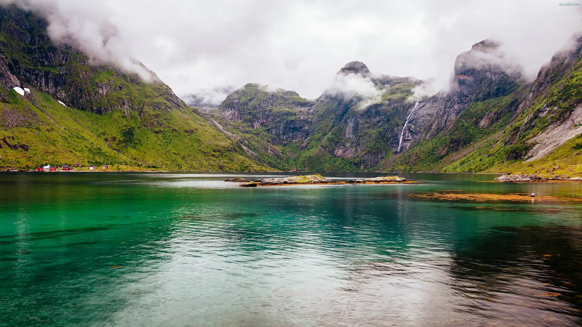 Góry, Lofoty, Okręg Nordland, Wyspa Moskenesøya, Wioska, Mgła, Wieś Sørvågenna, Norwegia, Jezioro Na Pulpit |