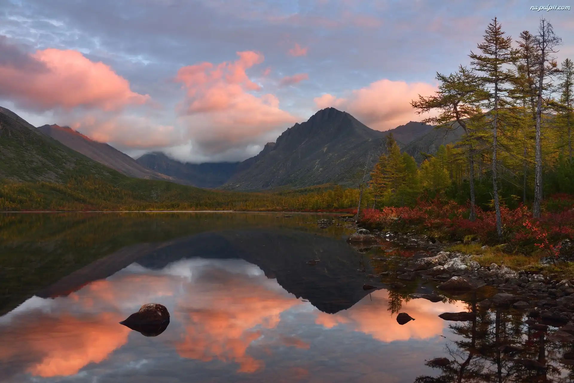 Góry Kołymskie, Odbicie, Chmury, Drzewa, Kołyma, Obwód magadański, Rosja, Wschód słońca, Jezioro Jack London, Jesień Na Pulpit |