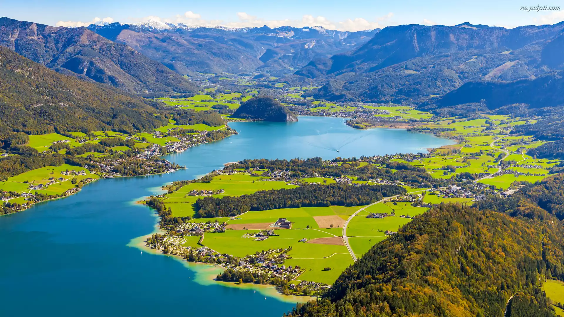 Alpy, Z lotu ptaka, Jezioro Wolfgangsee, Austria, Góry Na Pulpit