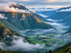 Drzewa, Dolina, Mgła, Góry, Chmury, Opadająca, Domy