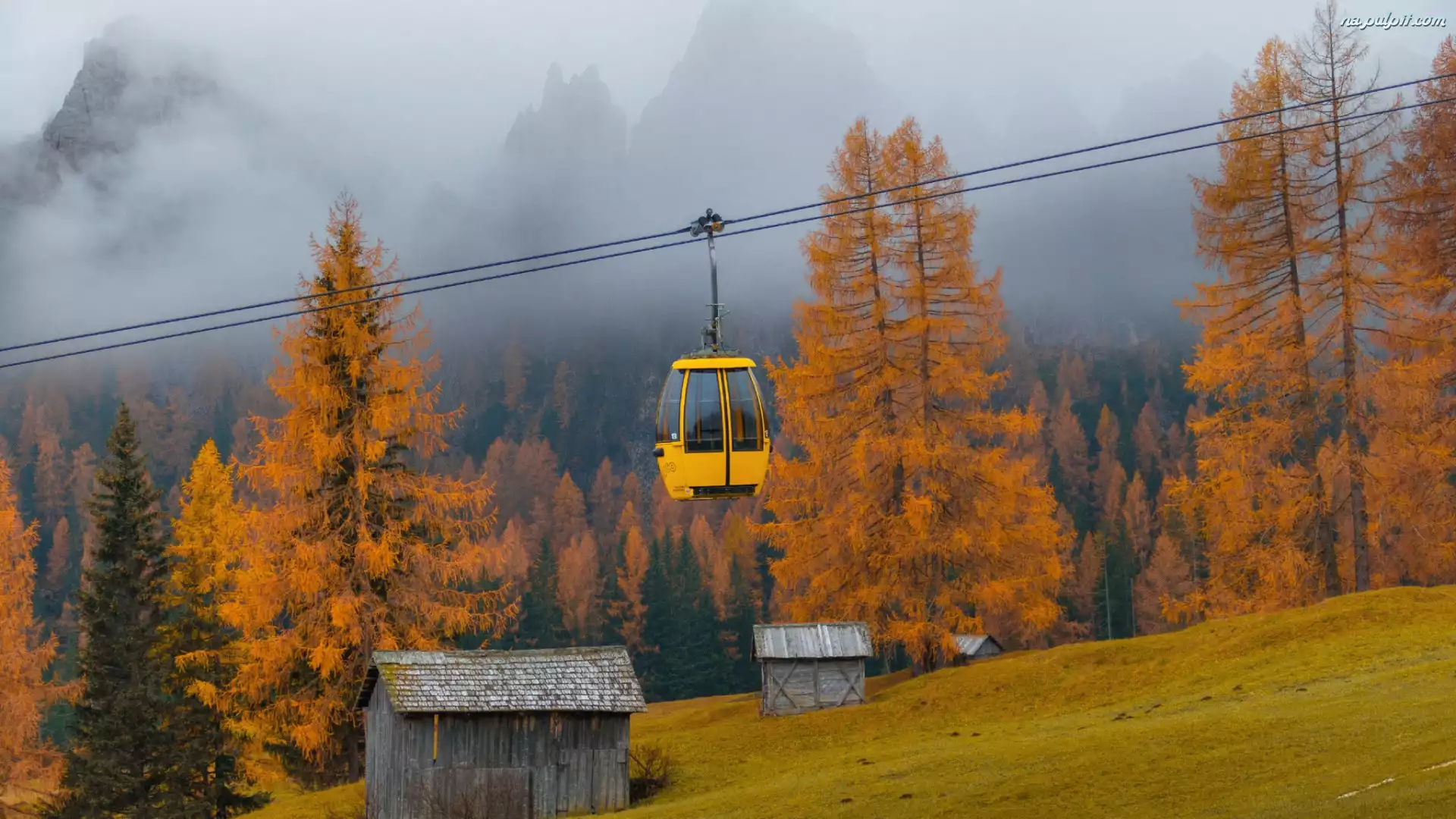 Kolejka linowa, Jesień, Góry, Modrzewie, Mgła Na Pulpit