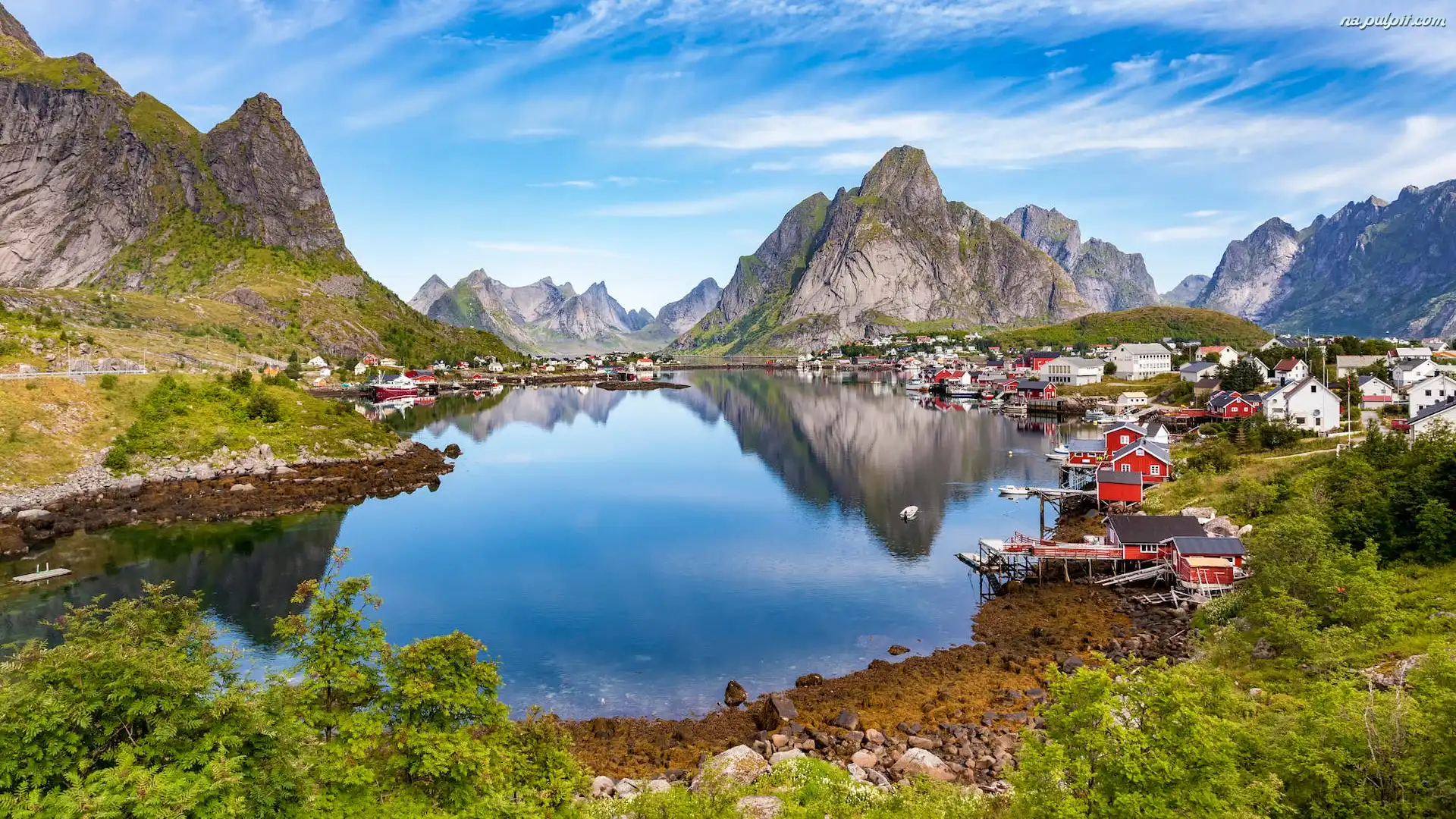 Góry, Morze Norweskie, Wioska Reine, Norwegia, Lofoty, Wyspa Moskenesoya, Domy Na Pulpit