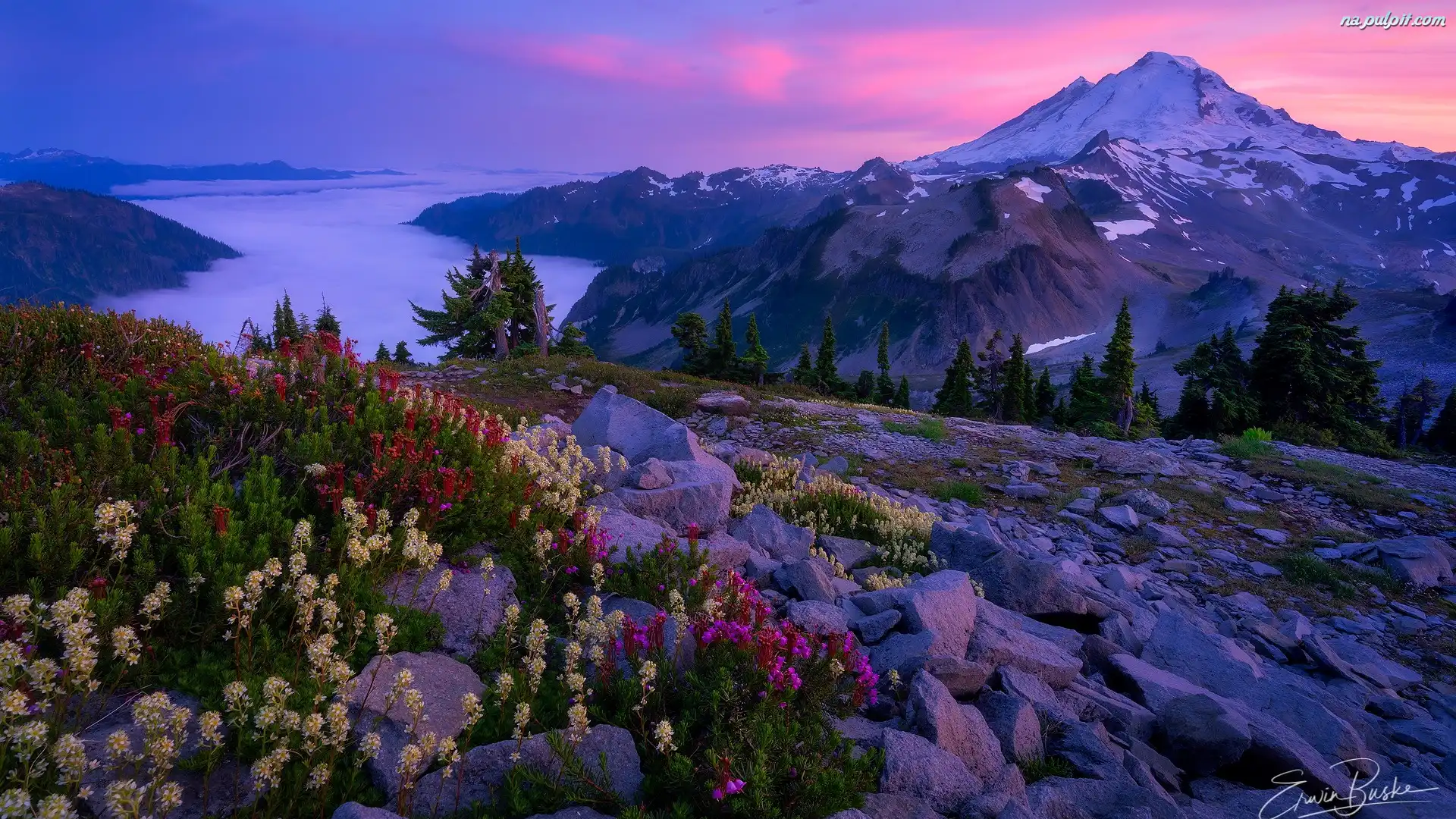 Mount Baker, Mgła, Skały, Góry Kaskadowe, Drzewa, Stan Waszyngton, Stany Zjednoczone, Dolina, Góra, Kwiaty Na Pulpit |