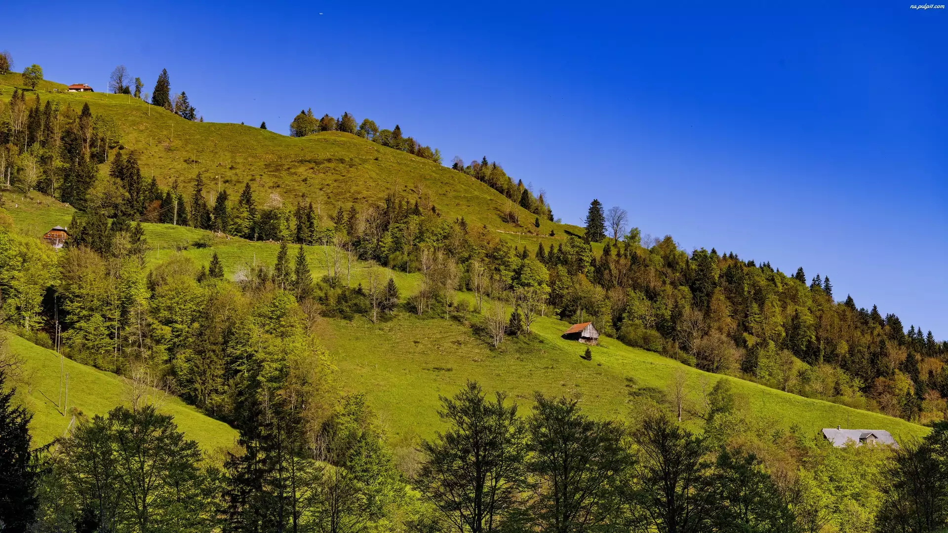 Niebo, Dom, Wzgórze, Góry, Drzewa, Natura