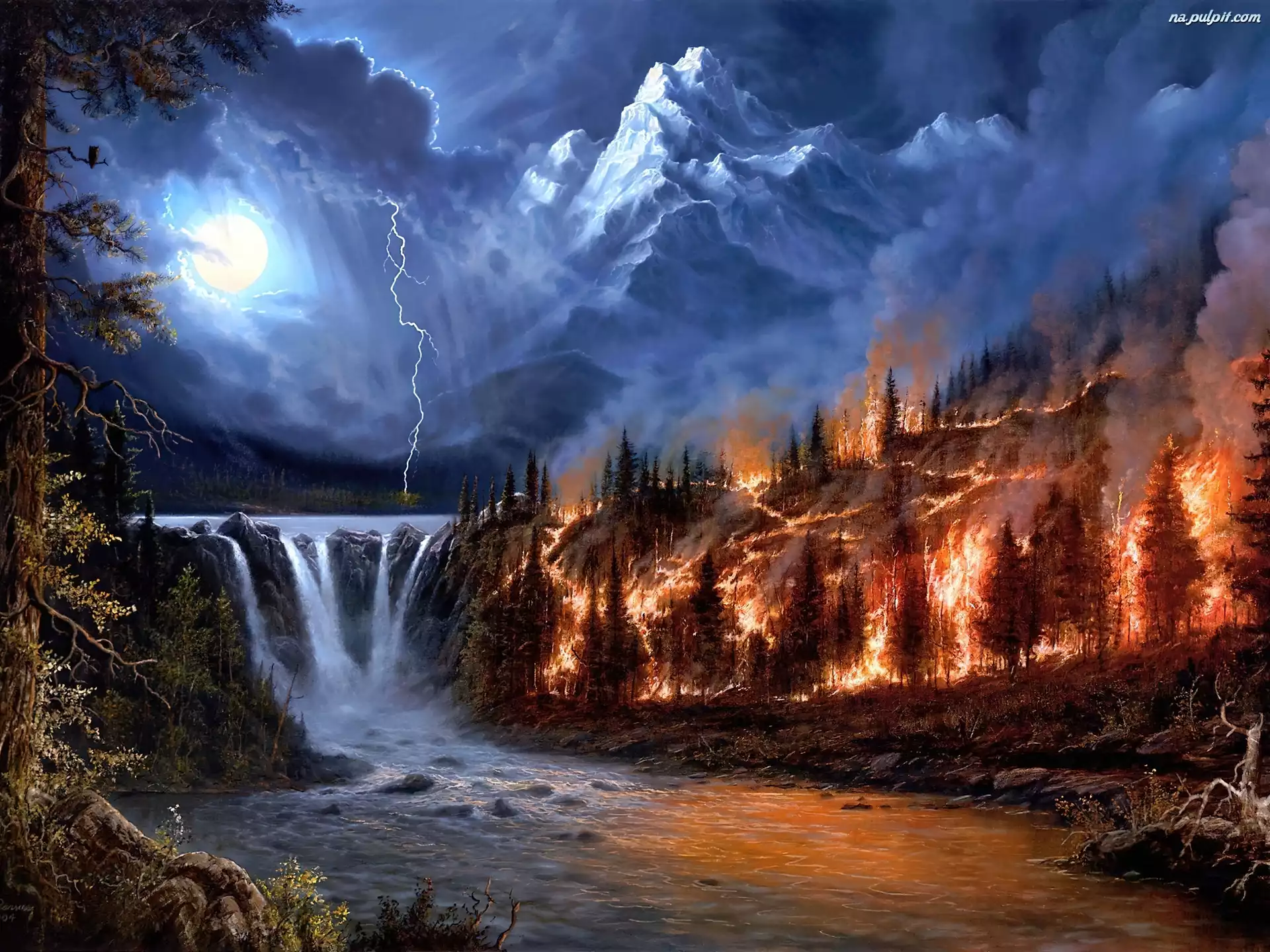 Góry, Burza, Wodospad, Noc, Pożar Na Pulpit