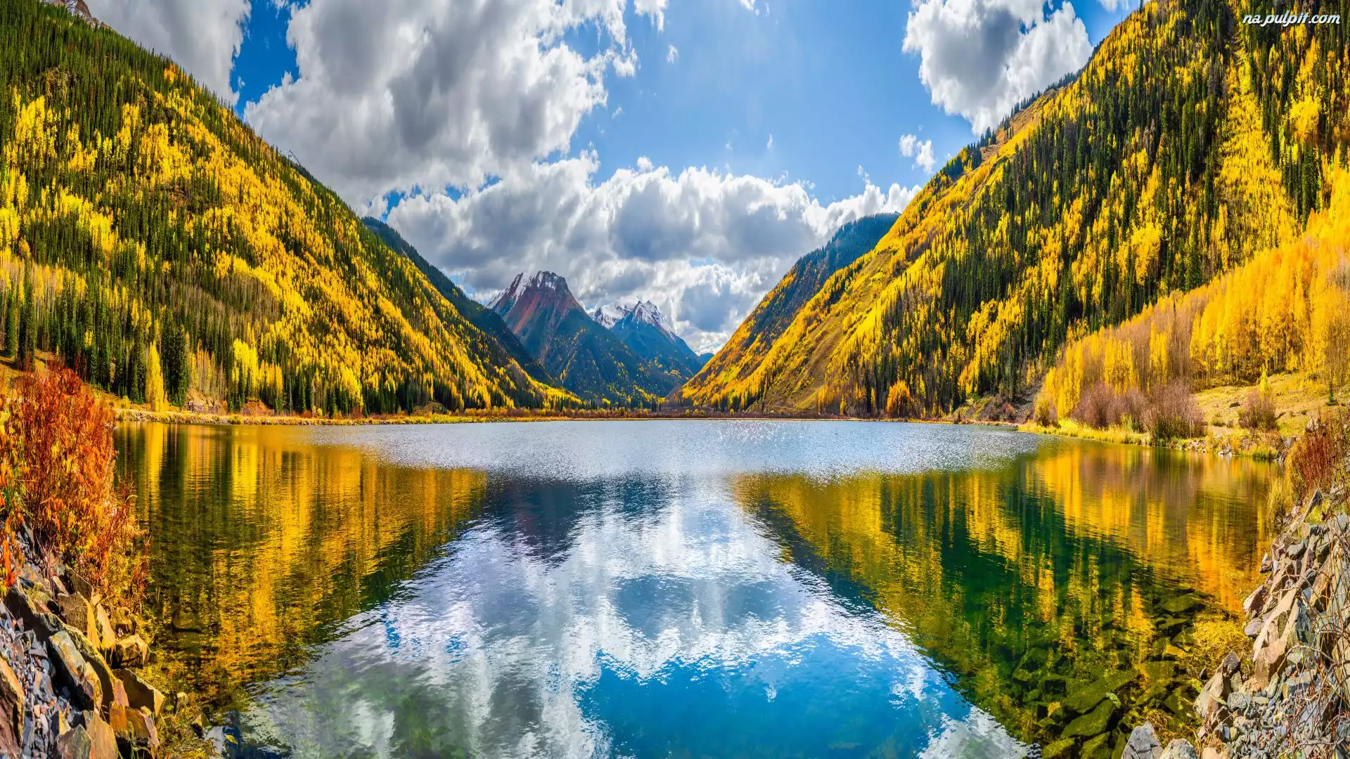 Obłoki, Jesień, Jezioro, Góry, Drzewa, Odbicie Na Pulpit