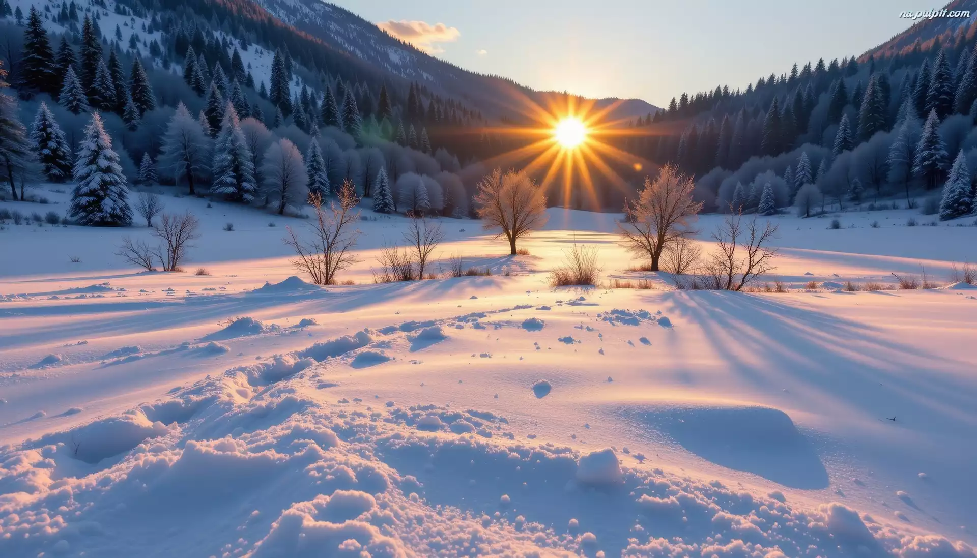Góry, Drzewa, Wschód słońca, Zima, Grafika AI, Poranek, Pole, Las Na Pulpit