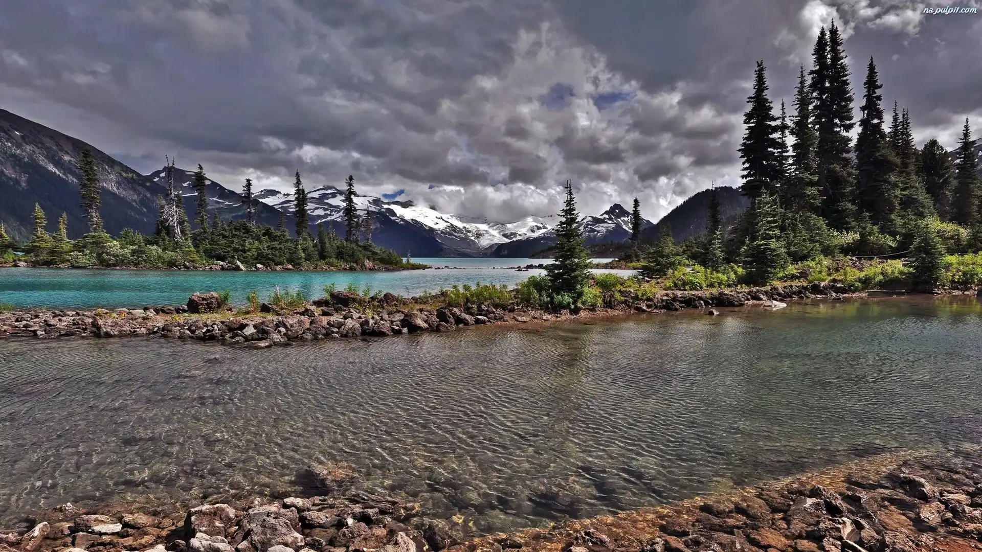 Góry, Kamienie, Drzewa, Ciemne, Rzeka, Chmury Na Pulpit