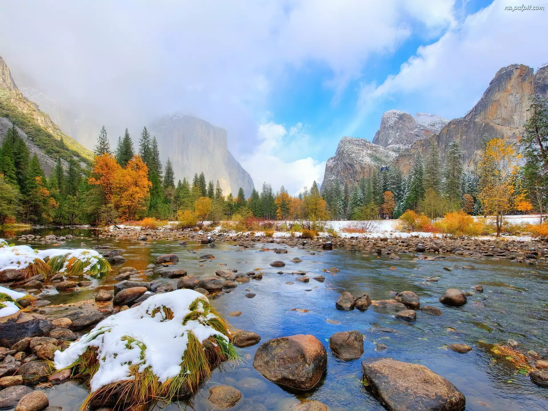 Śnieg, Rzeka, Las, Góry, Pierwszy