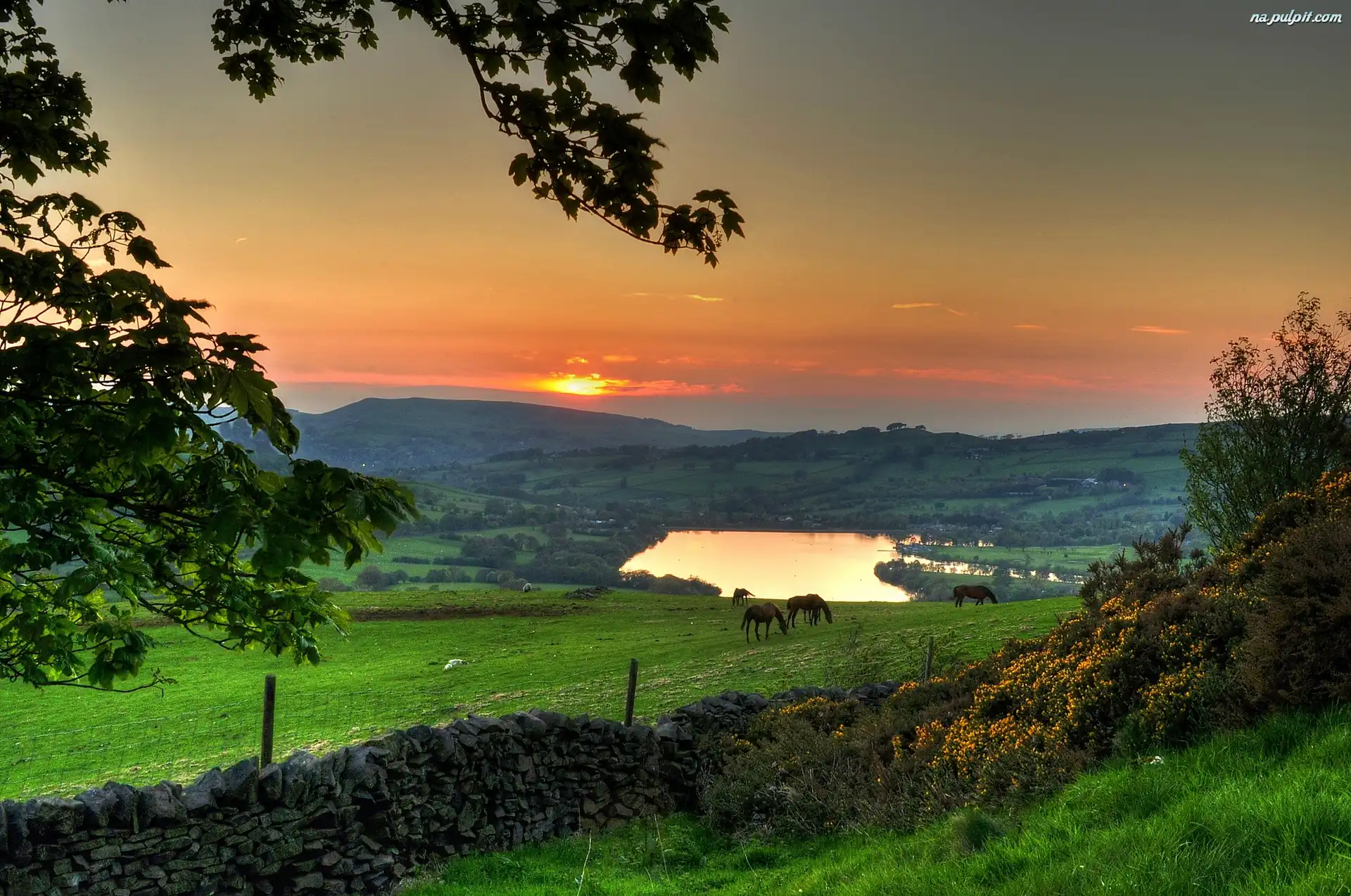Góry, Zachód, Słońca, Łąki, Rzeka, Konie Na Pulpit