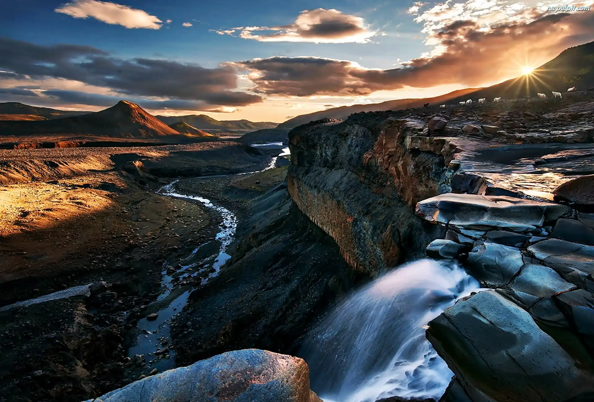 Świt, Rzeka, Góry, Wodospad Na Pulpit