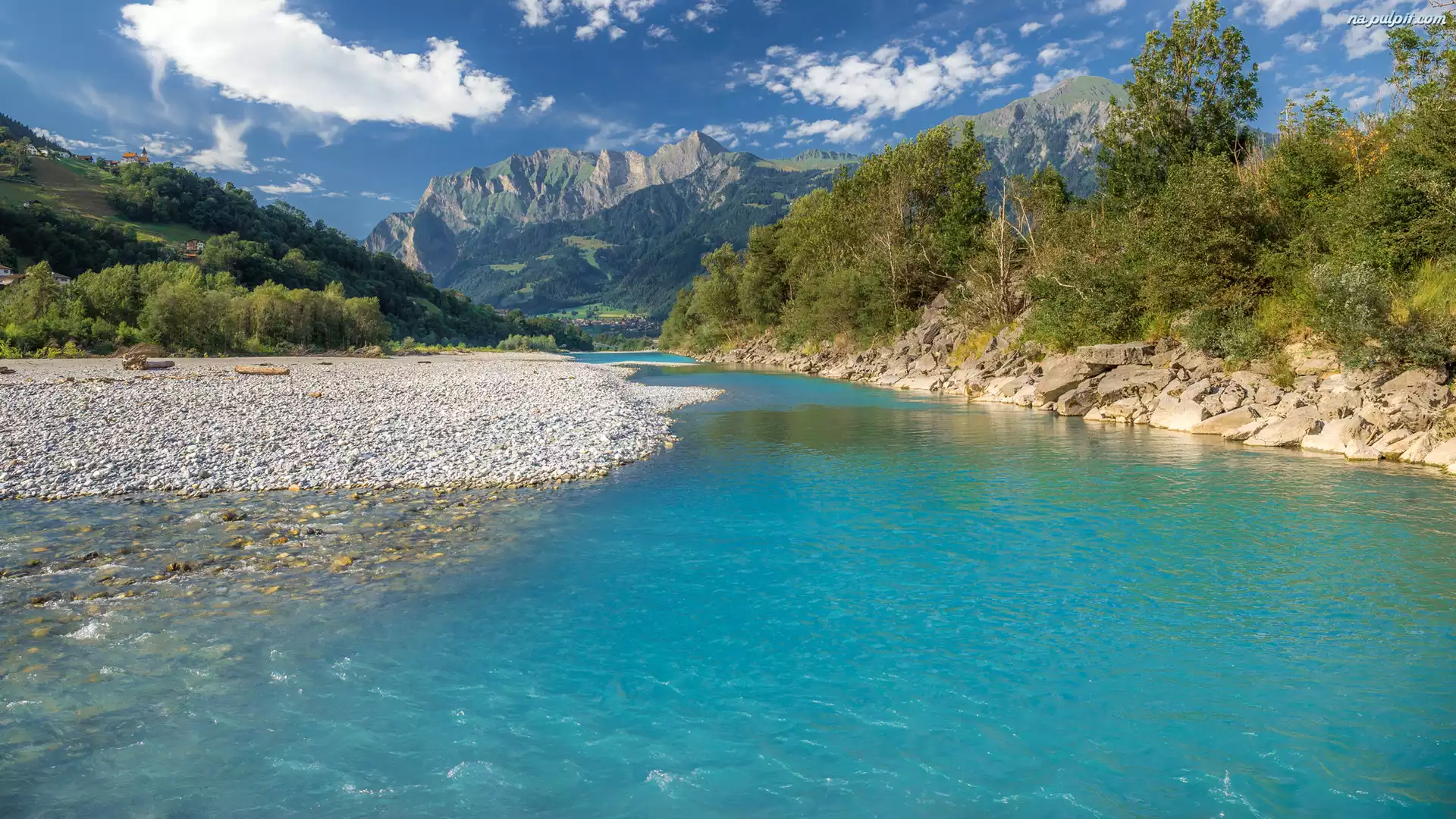 Rzeka, Drzewa, Wzgórza, Góry