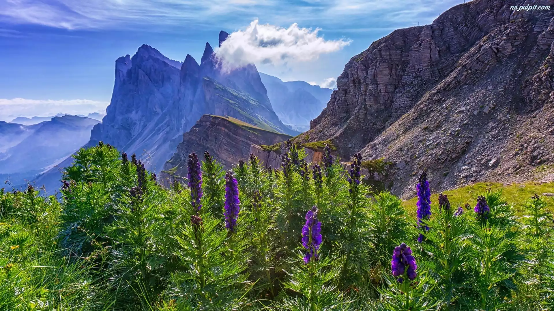 Kwiaty, Góry, Fioletowe, Dolomity, Alpy, Włochy, Góra Seceda Na Pulpit
