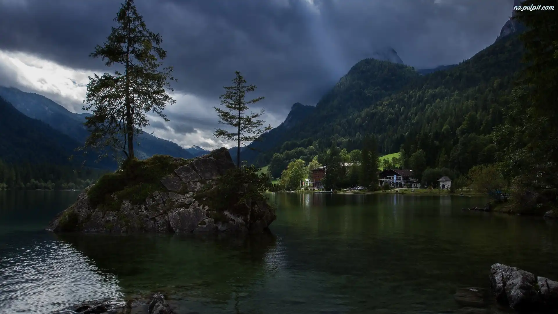 Niemcy, Domy, Skały, Góry, Jezioro, Hintersee, Drzewa Na Pulpit