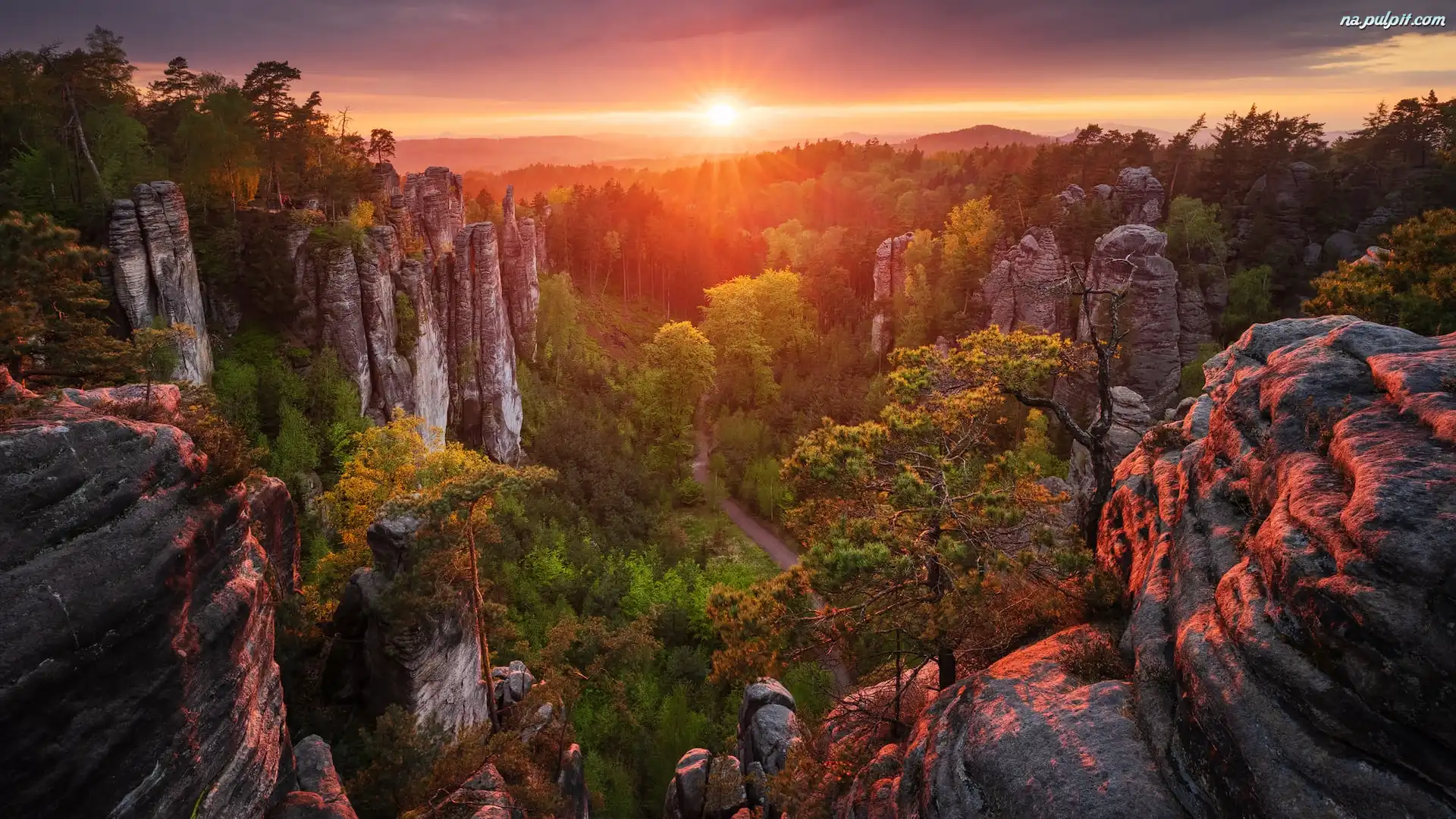 Góry, Zachód słońca, Skały, Drzewa Na Pulpit