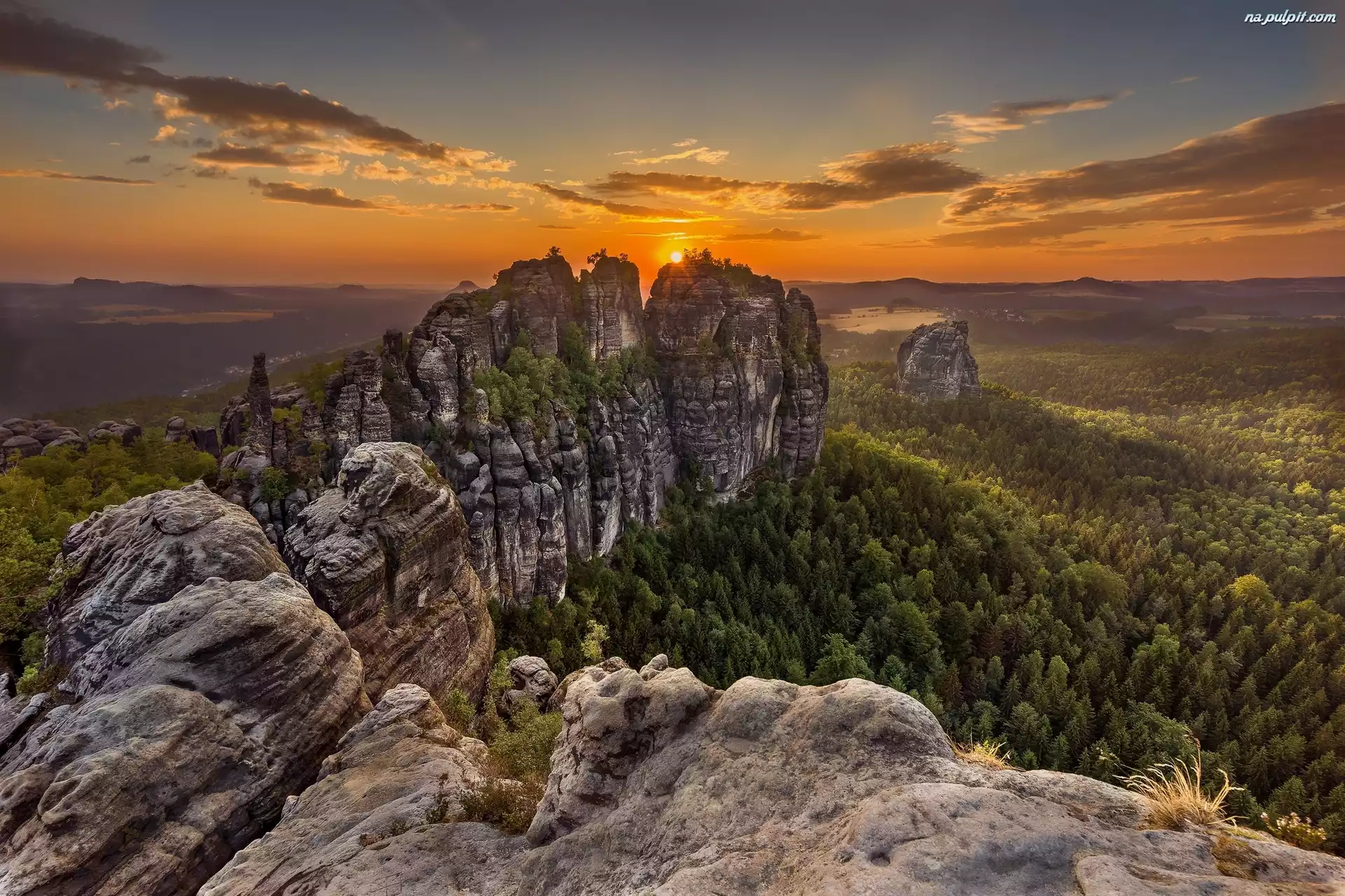 Zachód słońca, Góry Połabskie, Skały Schrammsteine, Park Narodowy Saskiej Szwajcarii, Niemcy Na Pulpit |