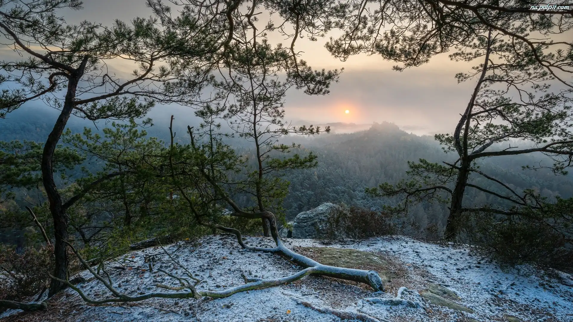 Śnieg, Wschód słońca, Góry, Drzewa, Mgła, Skały Na Pulpit