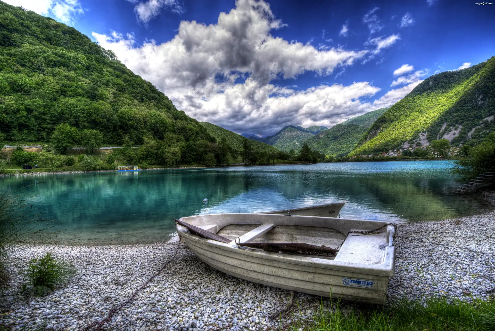 Góry, Brzeg, Łódka, Jezioro, Słowenia , Drzewa