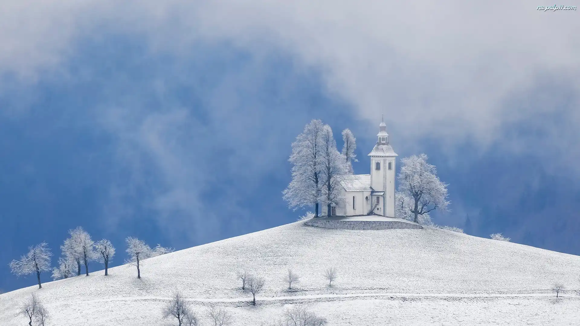 Góry, Gmina Skofja Loka, Wieś Krivo Brdo, Kościół św Tomasza, Alpy Julijskie, Drzewa, Zima, Słowenia, Śnieg Na Pulpit |