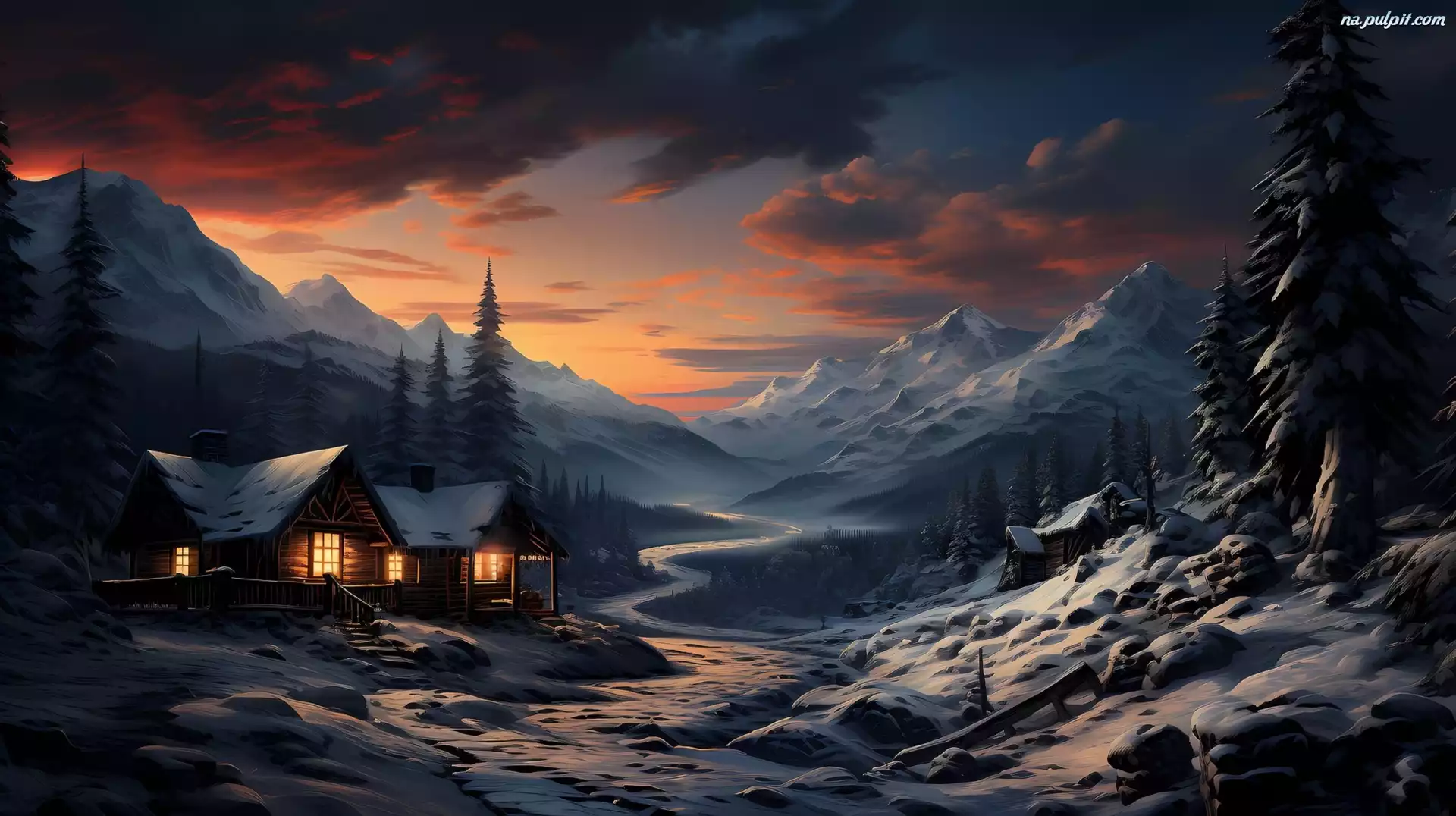 2D, Zima, Strumień, Góry, Dom, Rzeka, Wieczór Na Pulpit