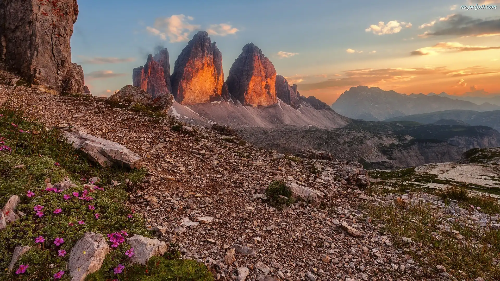 Kwiaty, Włochy, Rozświetlone, Góry, Dolomity, Skały, Zachód słońca, Kamienie, Tre Cime di Lavaredo Na Pulpit |