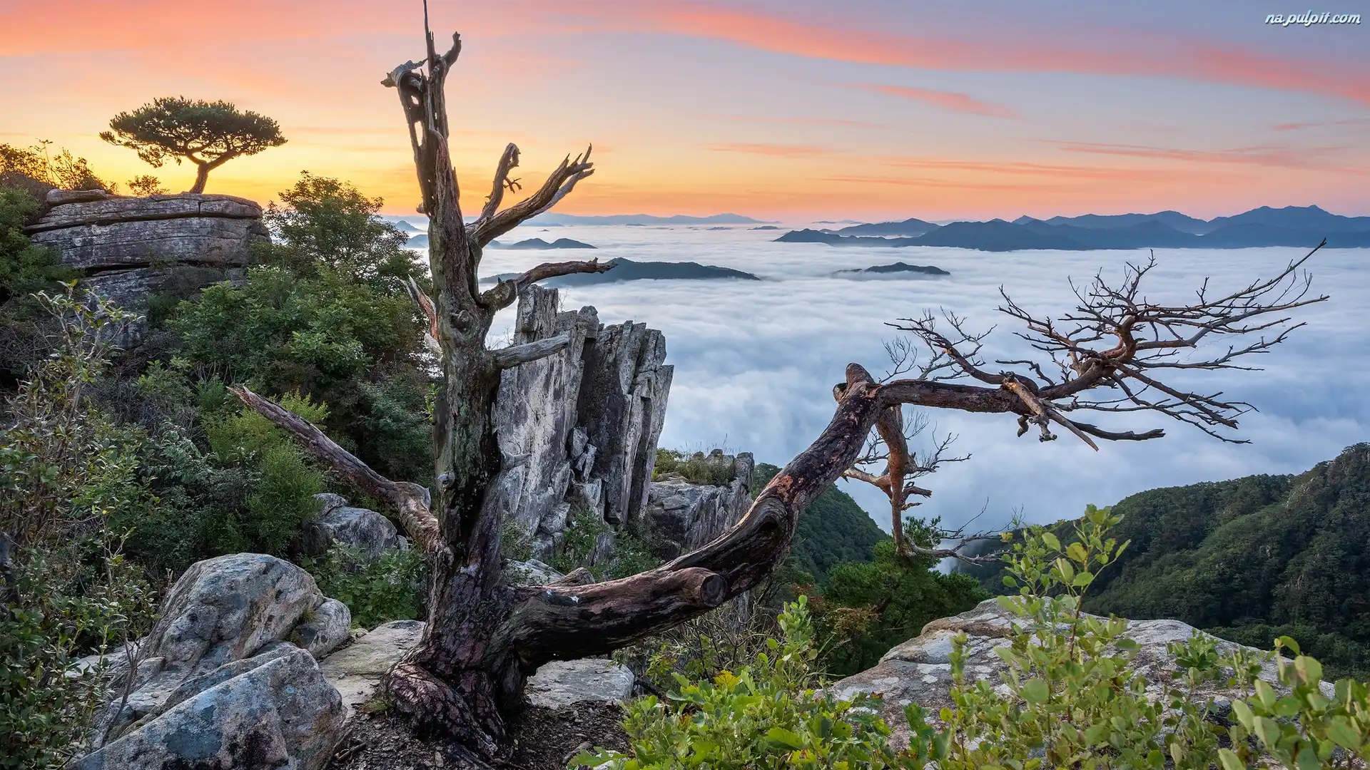 Roślinność, Góry, Drzewo, Skały, Mgła, Wschód słońca, Uschnięte Na Pulpit