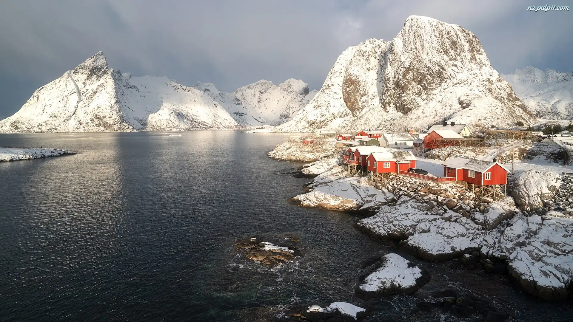 Góra Higravstinden, Lofoty, Domy, Wioska Hamnoy, Zima, Morze, Norwegia, Góry Na Pulpit