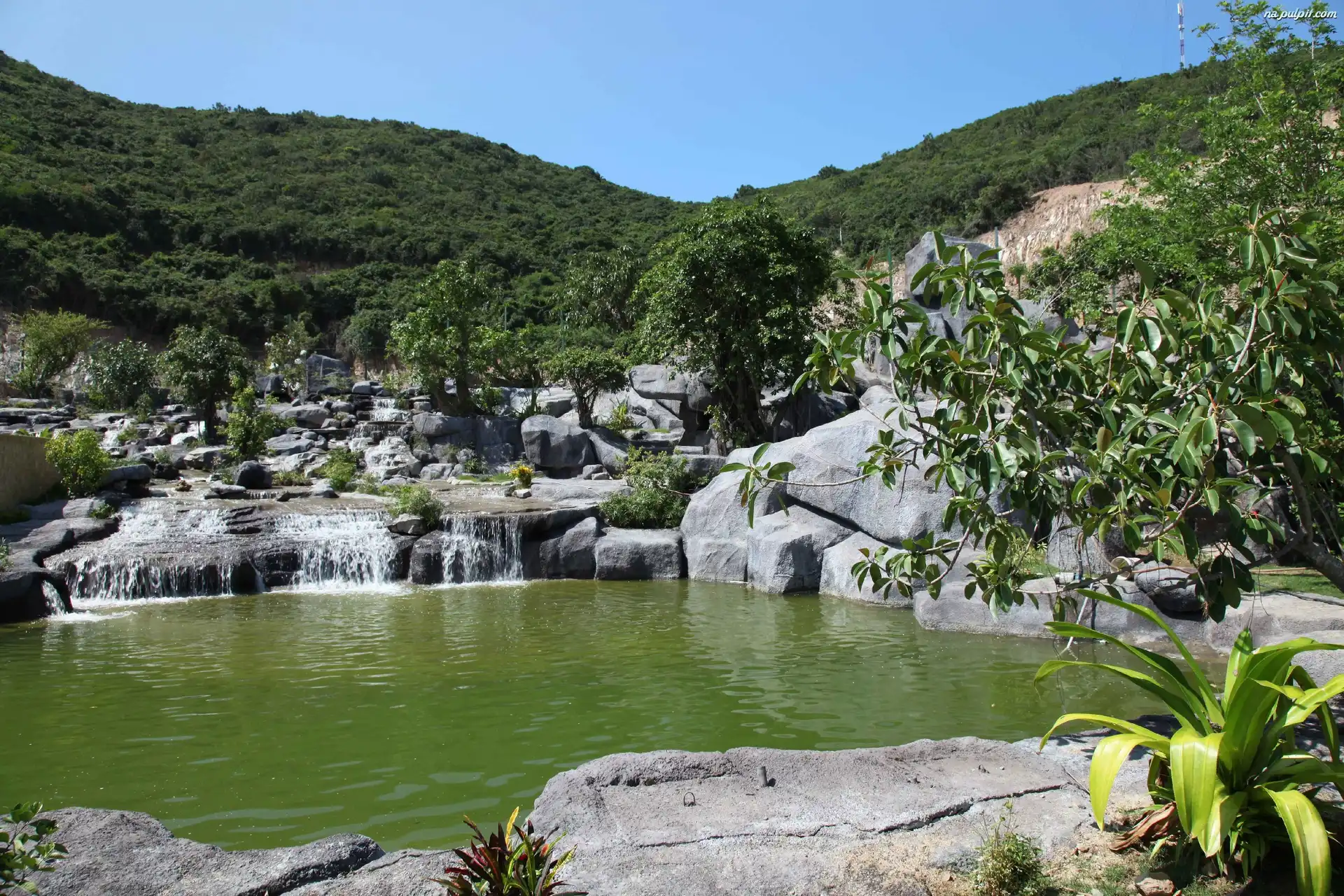 Góry, Skały, Jeziorko, Wodospad, Zalesione