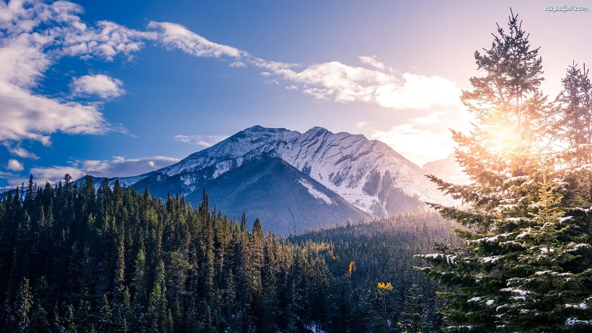 Wschód słońca, Prowincja Alberta, Drzewa, Góry Skaliste, Park Narodowy Banff, Kanada, Las Na Pulpit
