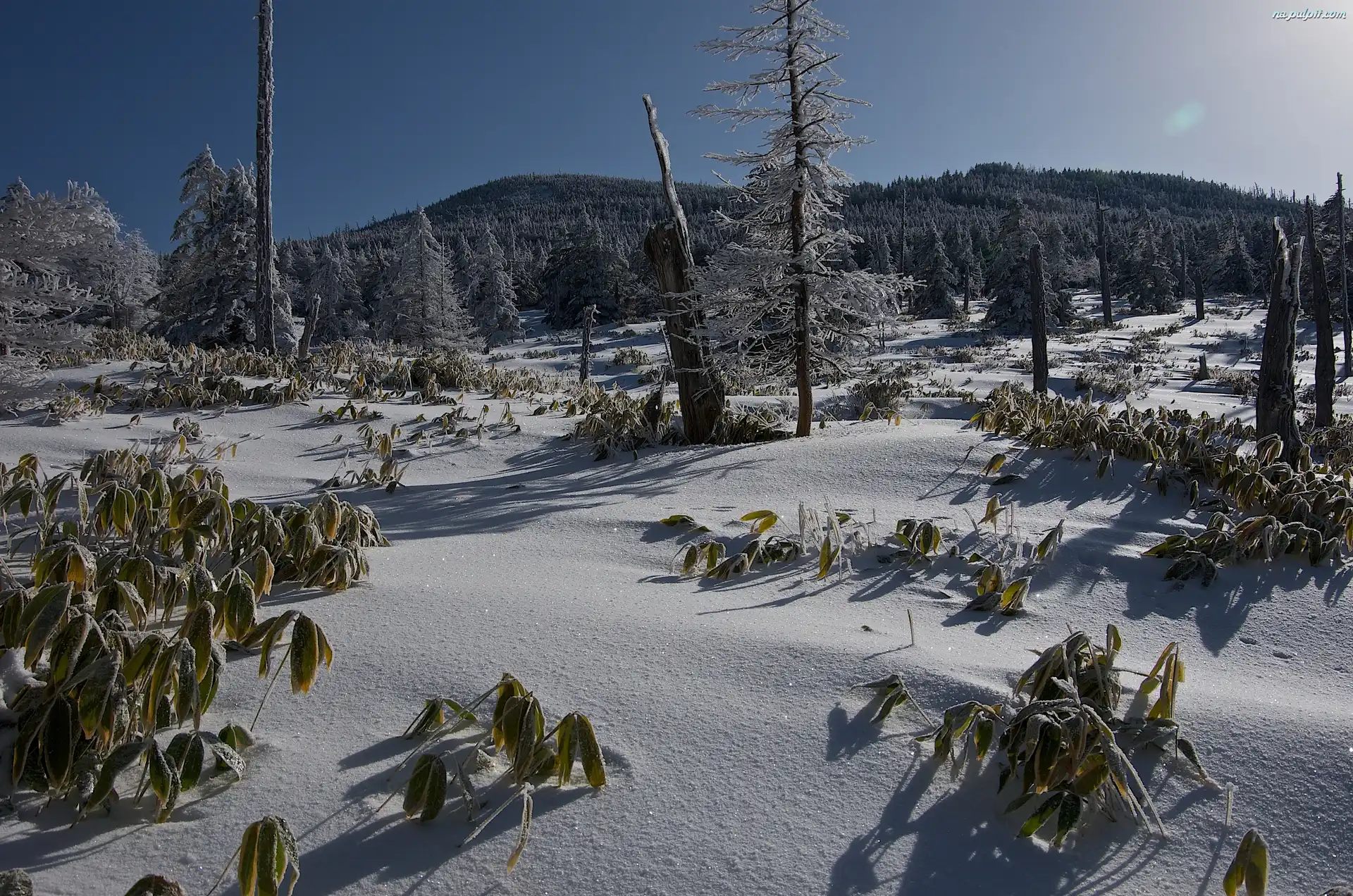 Śnieg, Wschód, Lasy, Góry, Słońca