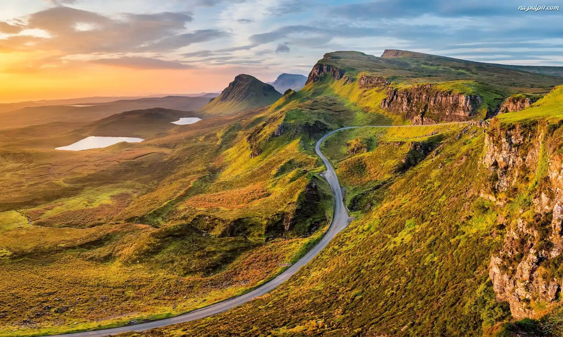 Góry, Quiraing, Ścieżka, Szkocja, Chmury, Jeziora, Wyspa Skye, Wzgórza