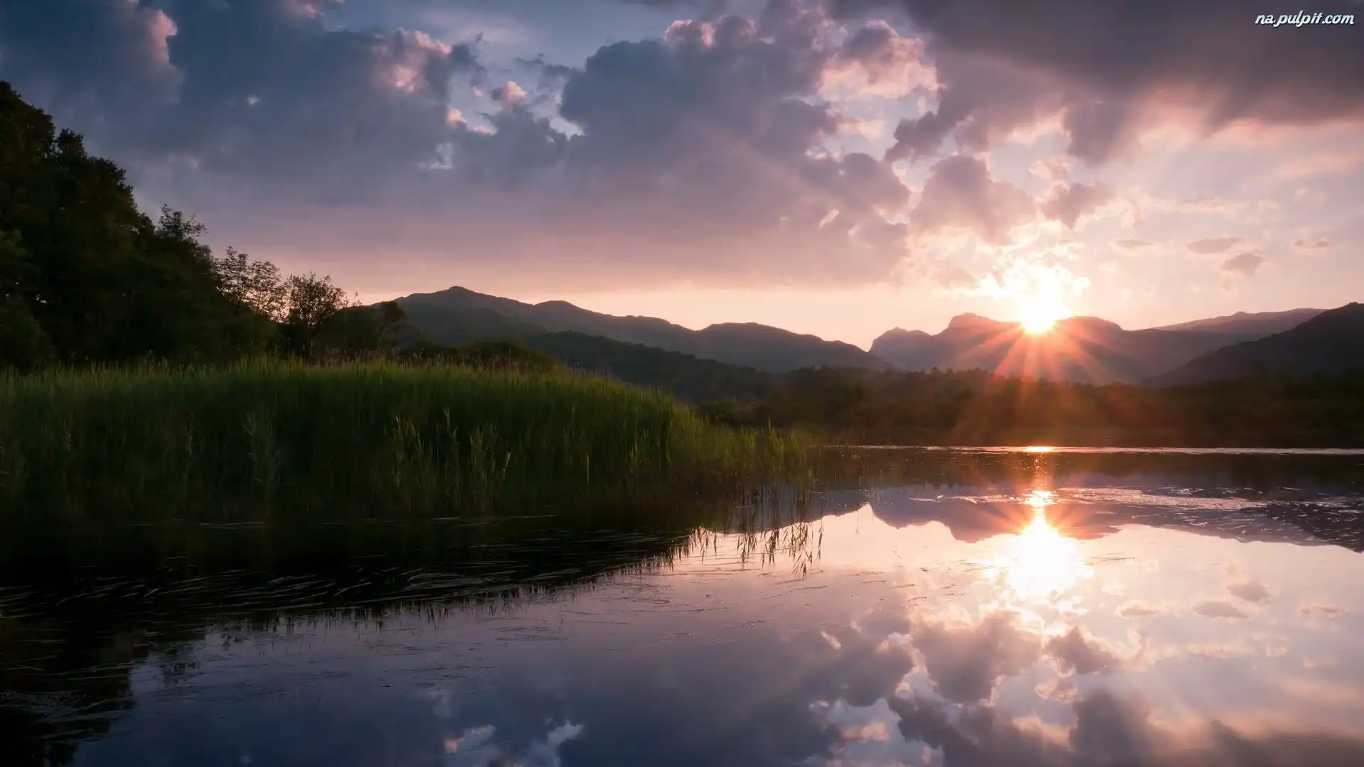 Góry, Jezioro, Słońca, Zachód, Trzciny Na Pulpit