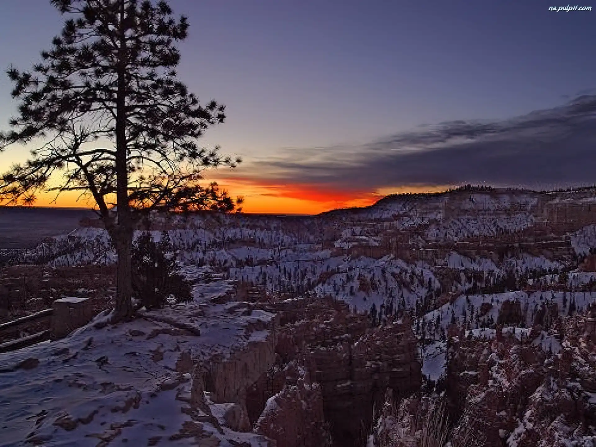 Góry, Zima, Słońca, Zachód, Drzewo