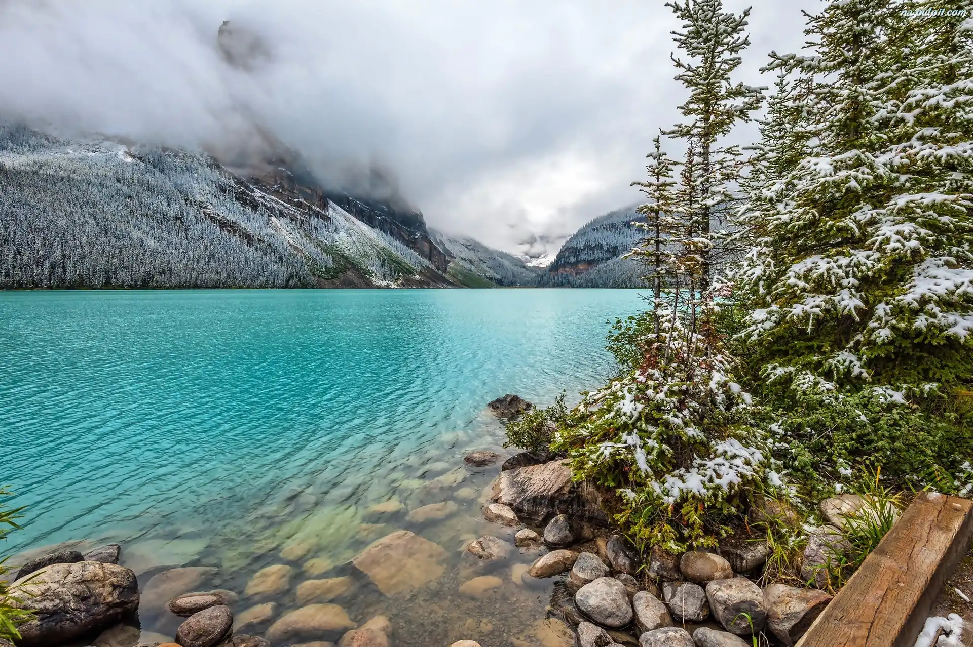 Góry, Kamienie, Drzewa, Mgła, Zima, Jezioro