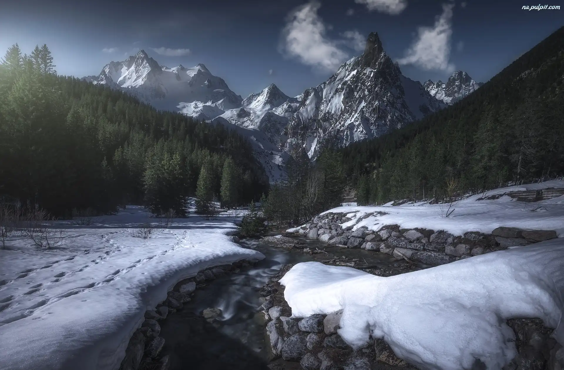 Góry, Śnieg, Drzewa, Rzeka, Zima, Kamienie
