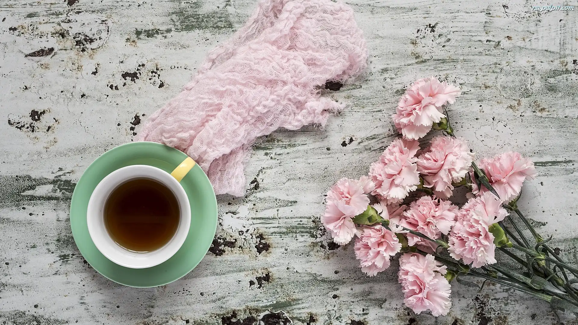 Goździki, Filiżanka, Herbata, Różowe Na Pulpit