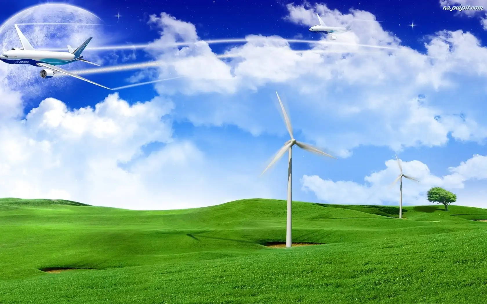Grafika, Samoloty, Wiatraki, Łąki, Chmury Na Pulpit