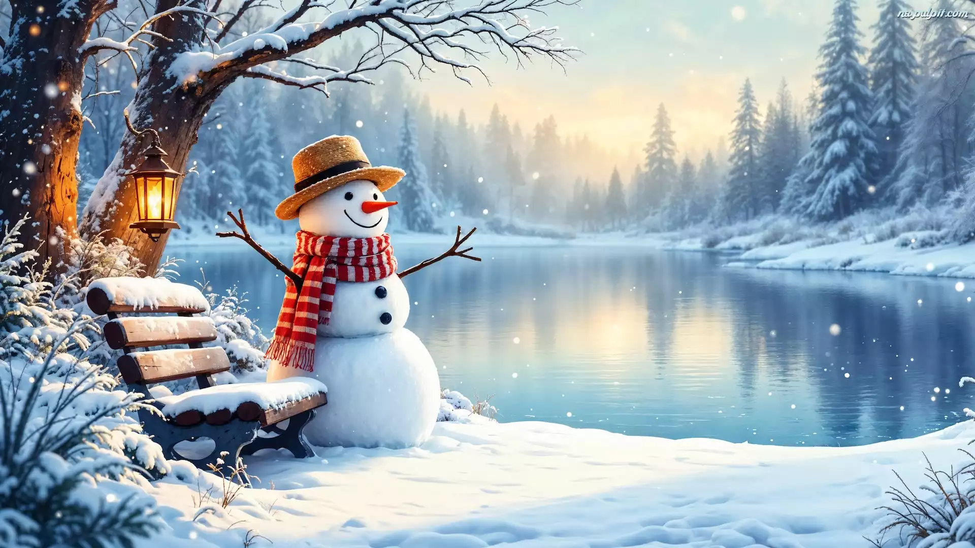 Drzewa, Grafika, Bałwan, Ławka, Jezioro Na Pulpit