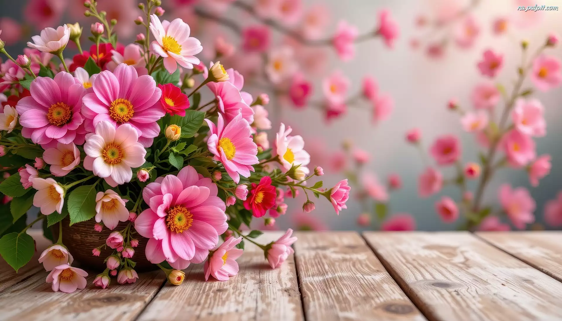 Deski, Różowe, Kwiaty, Grafika AI, Bukiet Na Pulpit