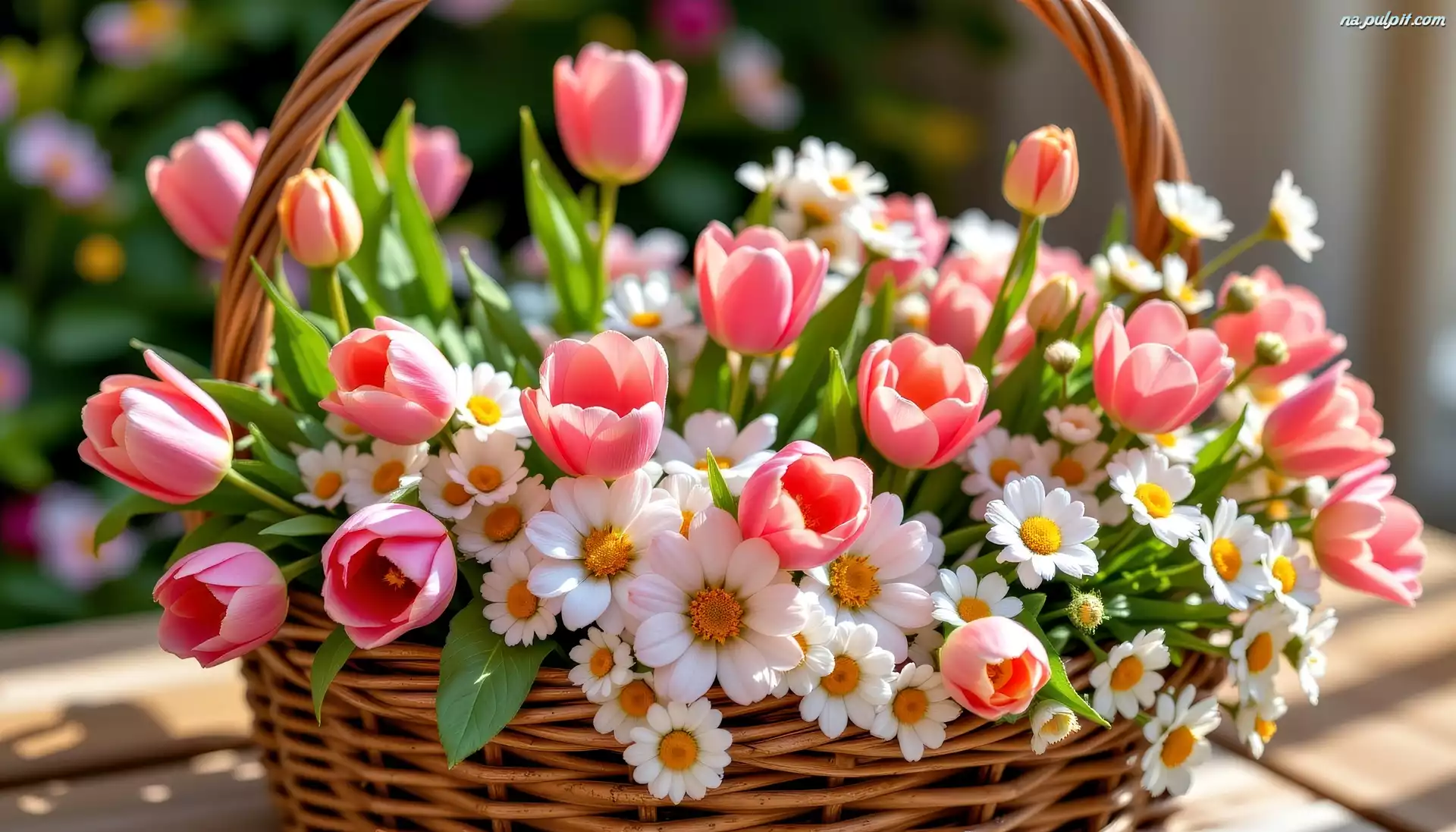 Koszyk, Tulipany, Stokrotki, Grafika AI, Bukiet Na Pulpit